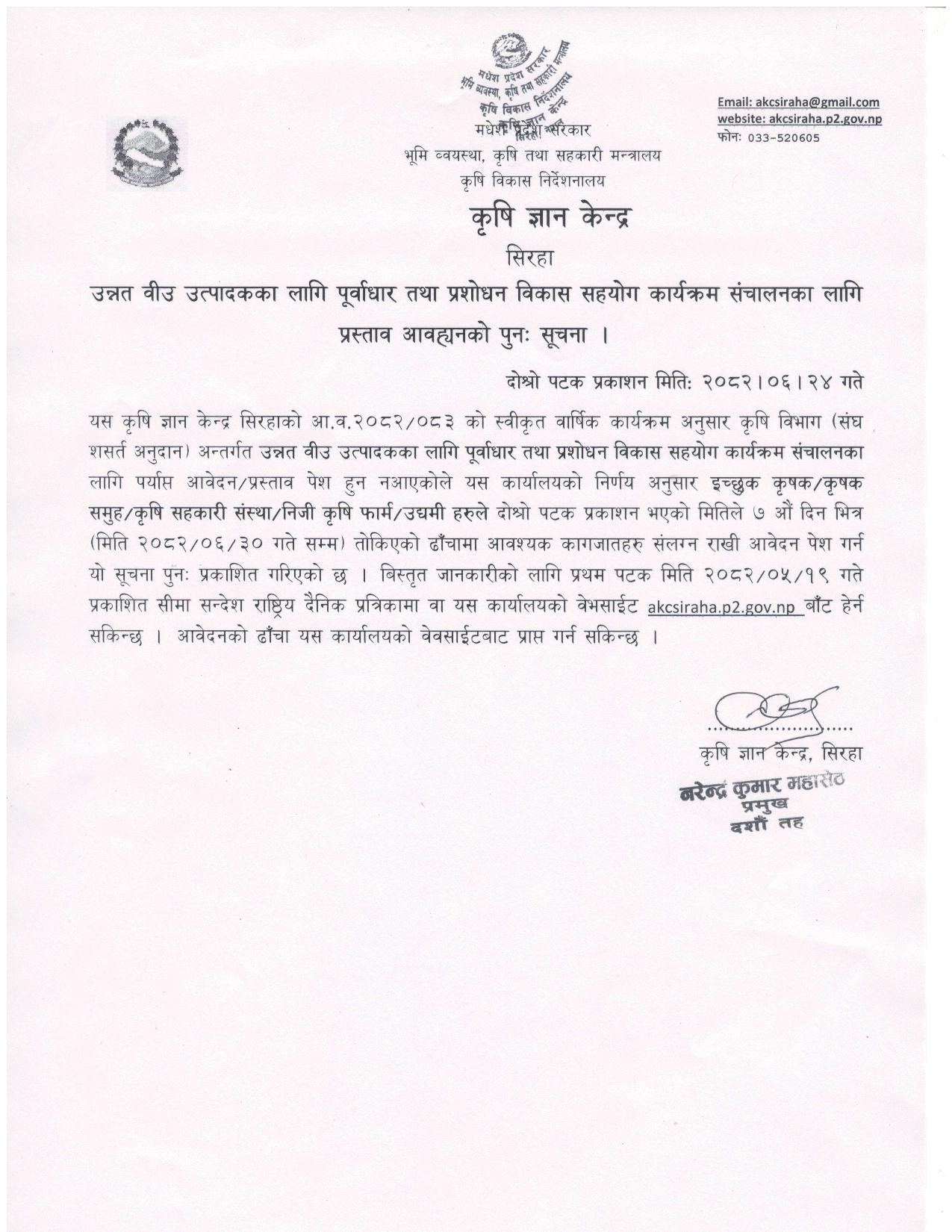 उन्नत वीउ उत्पादकका लागि पूर्वाधार तथा प्रशोधन विकास सहयोग कार्यक्रम संचालनका लागि प्रस्ताव आवह्वानको पुनः सूचना।