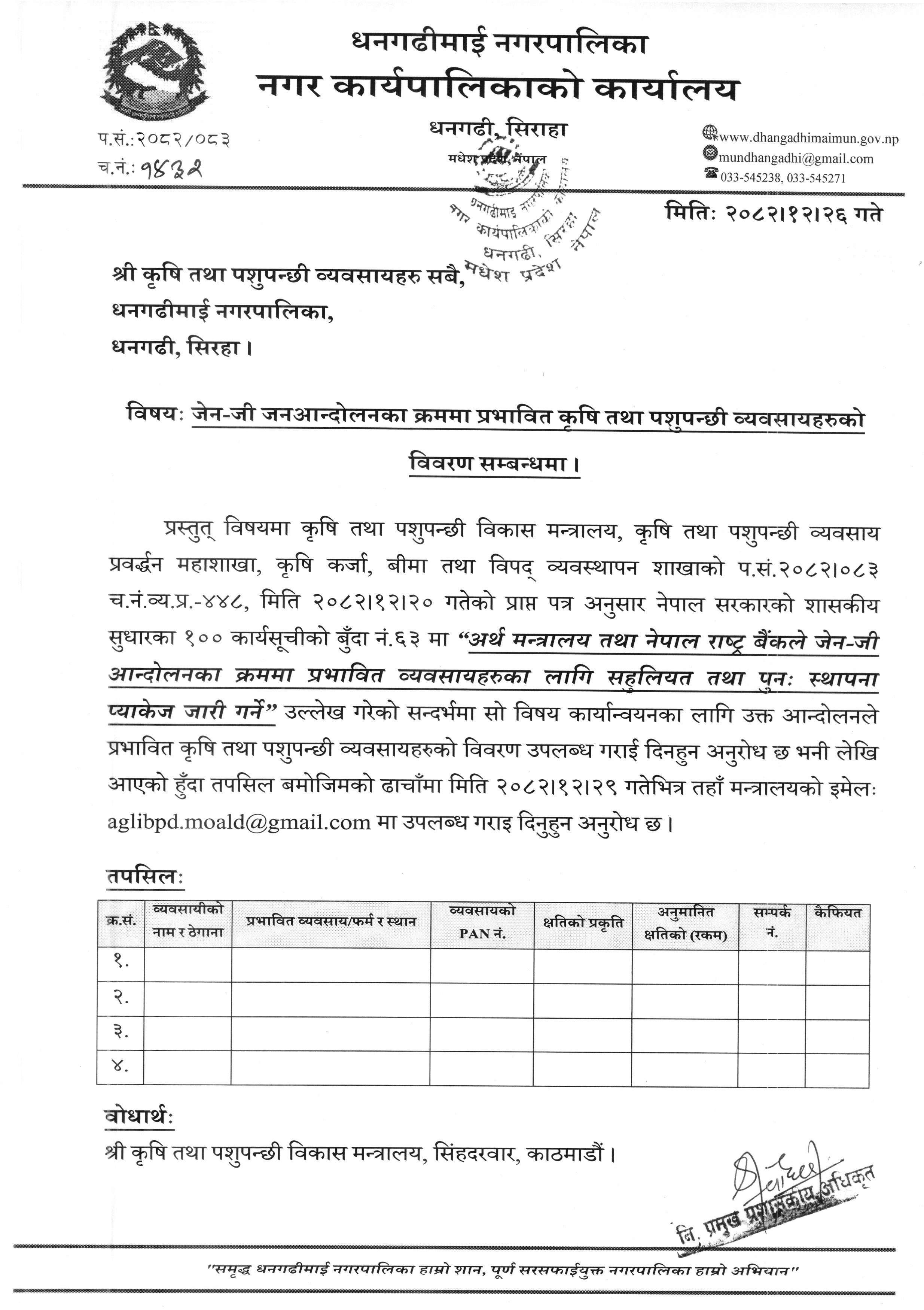 जेन-जी जनआन्दोलनका क्रममा प्रभावित कृषि तथा पशुपन्छी व्यवसायहरुको विवरण सम्बन्धमा।