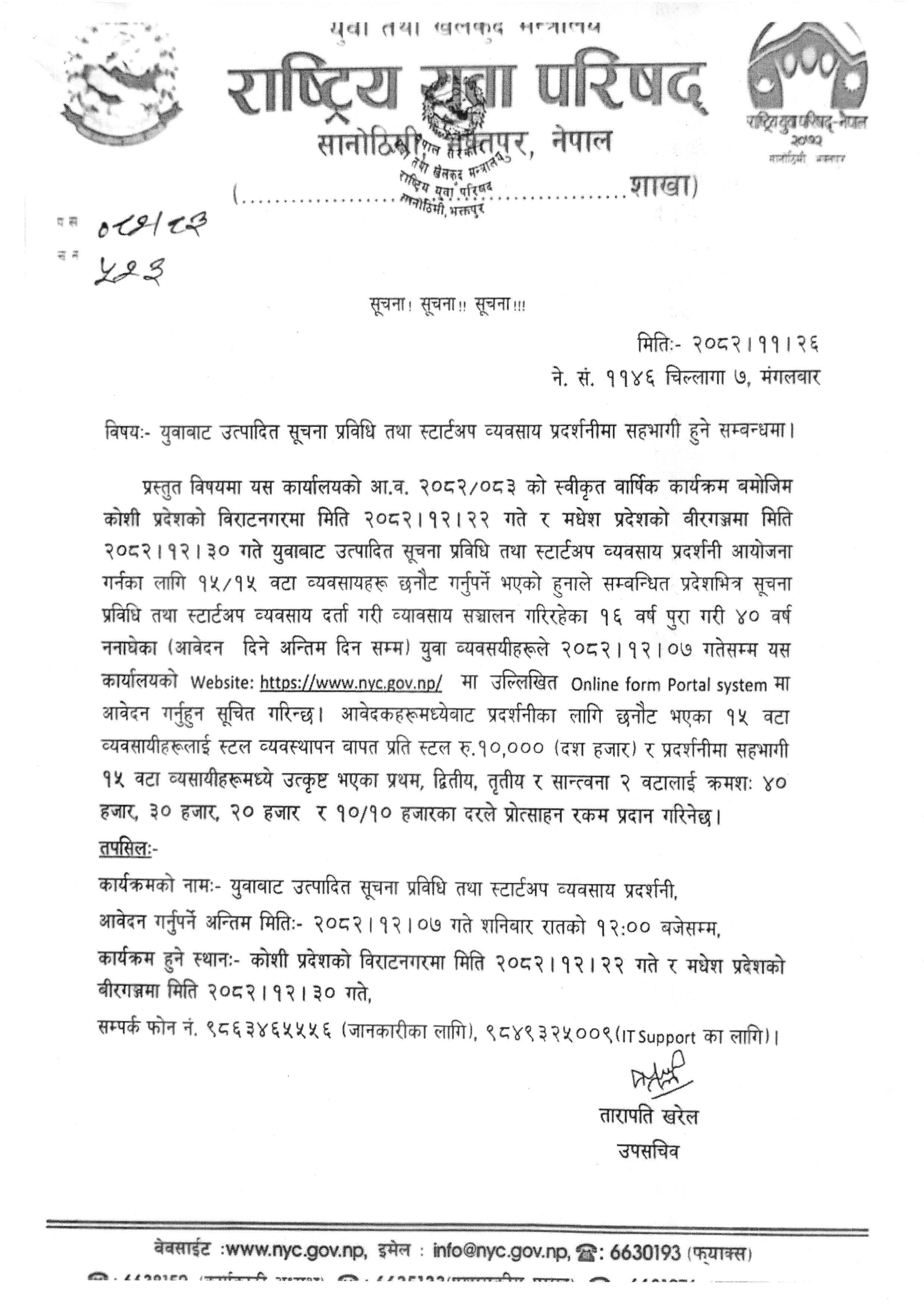 युवाबाट उत्पादित सूचना प्रविधि तथा स्टार्टअप व्यवसाय प्रदर्शनीमा सहभागी हुने सम्बन्धमा।