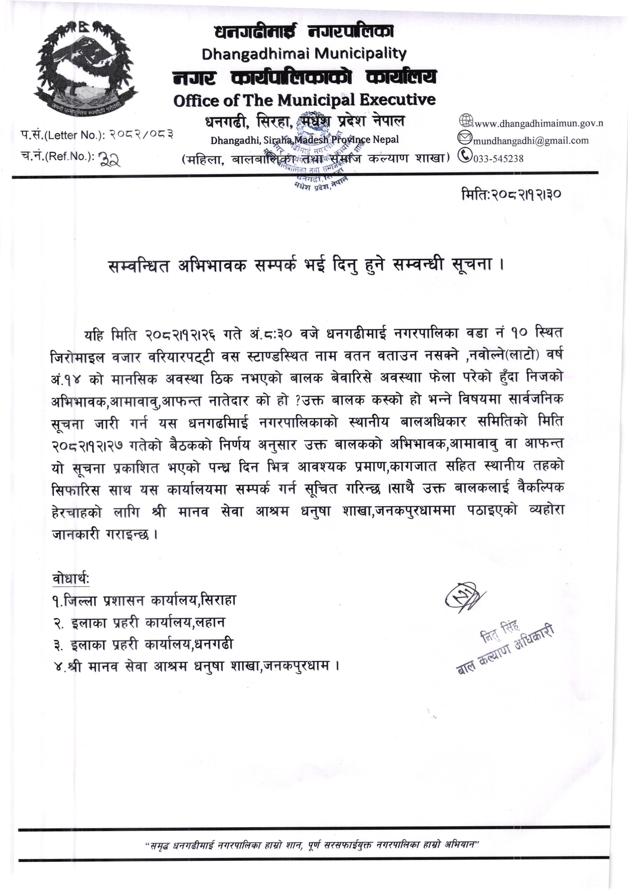 » सम्बन्धित अभिभावक सम्पर्क भई दिनु हुने सम्बन्धी सूचना।
