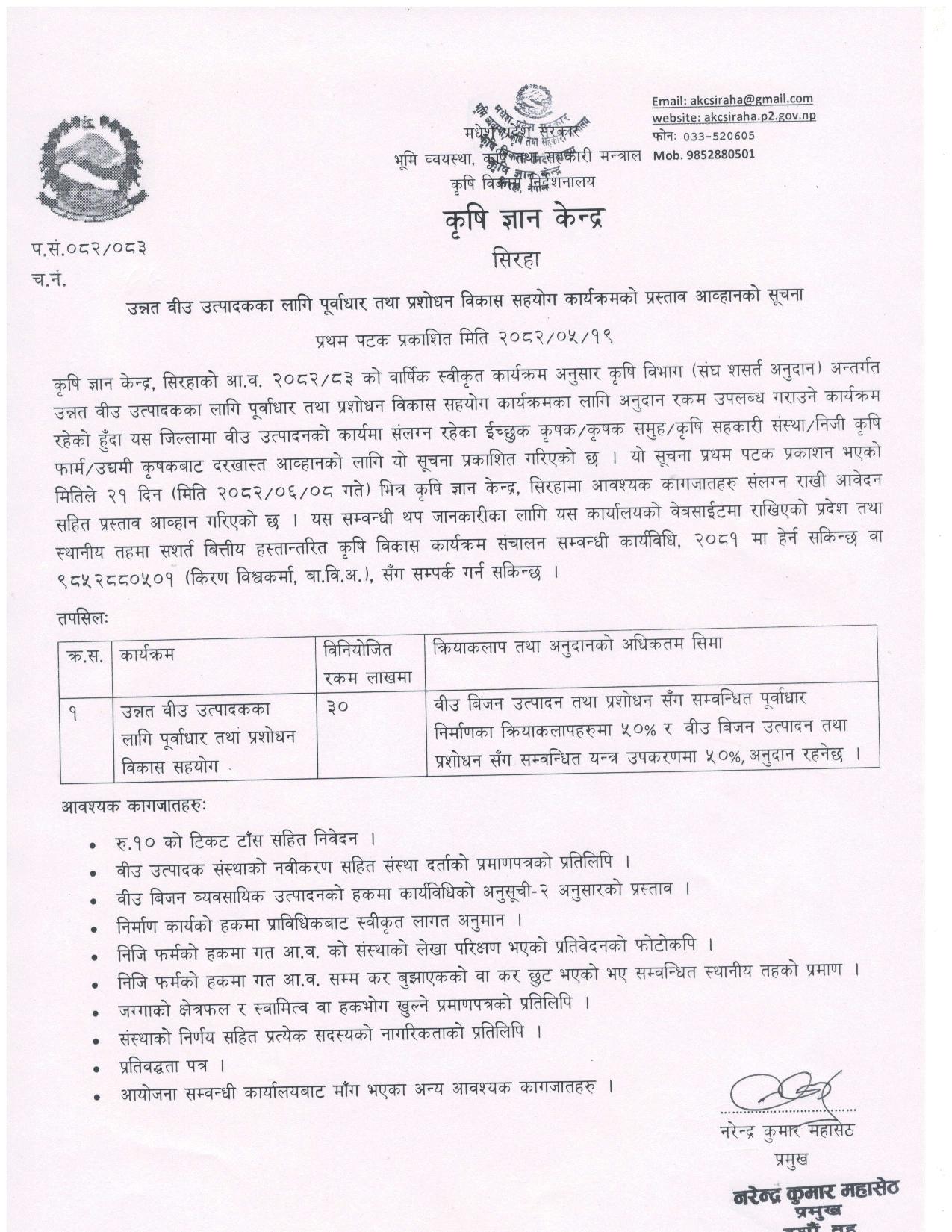 उन्नत वीउ उत्पादकका लागि पूर्वाधार तथा प्रशोधन विकास सहयोग कार्यक्रमको प्रस्ताव आव्हानको सूचना ।