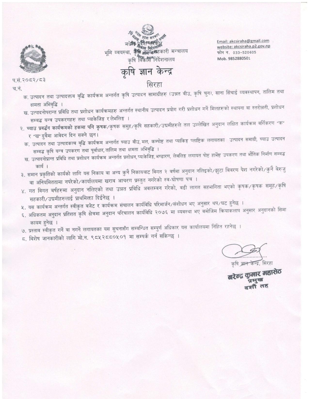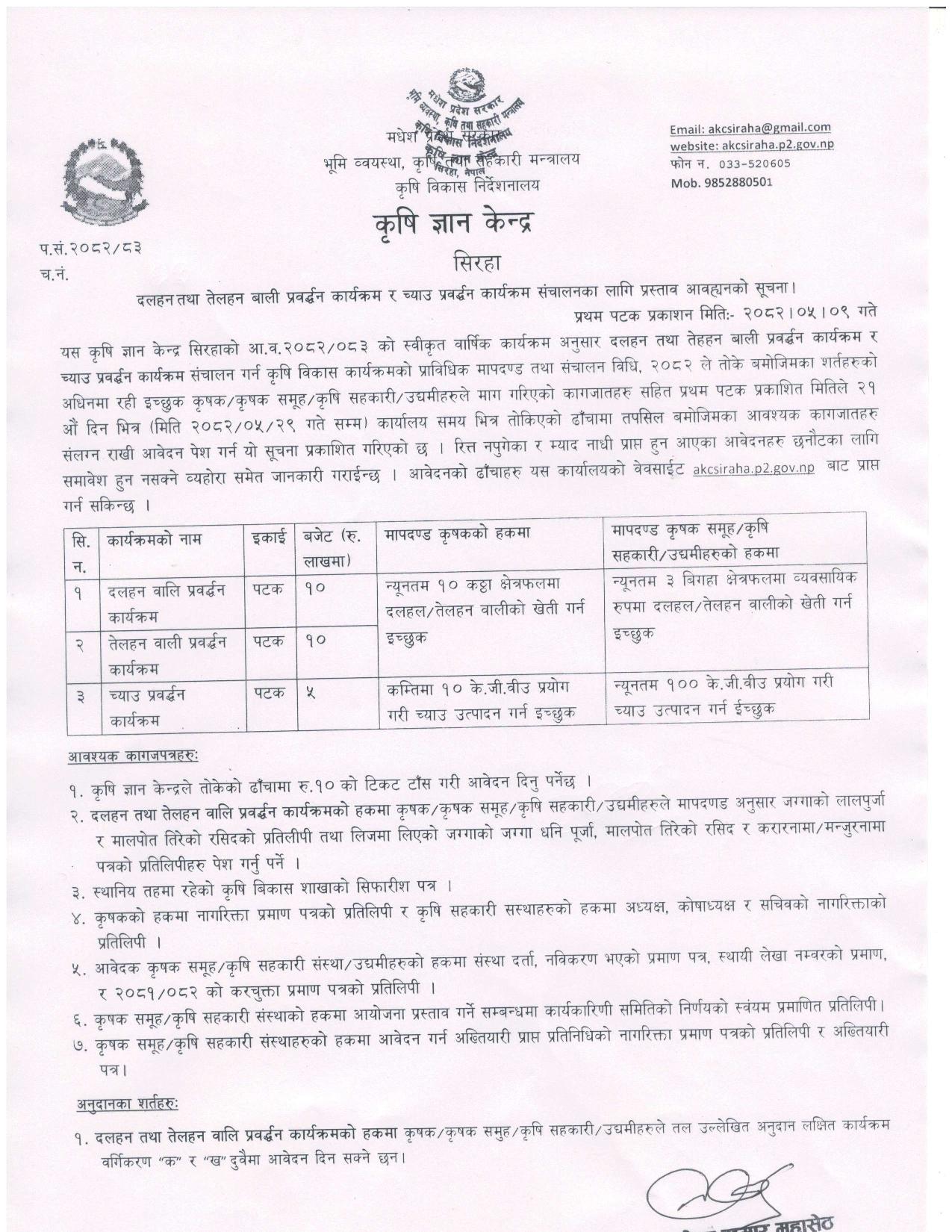 दलहन तेलहन बाली प्रवर्द्धन कार्यक्रम र च्याउ प्रवर्द्धन कार्यक्रम संचालनका लागि प्रस्ताव आवह्वानको सूचना ।