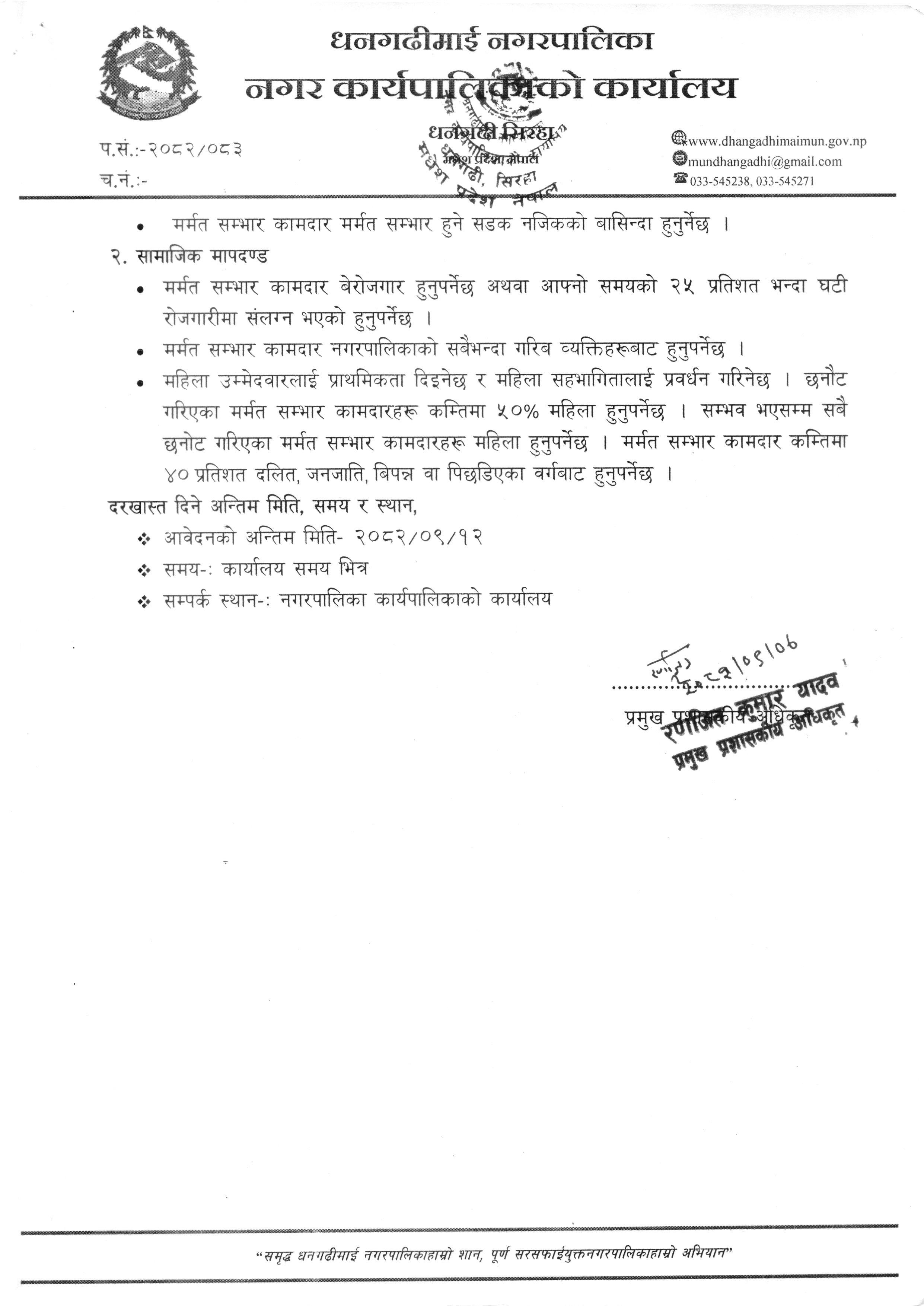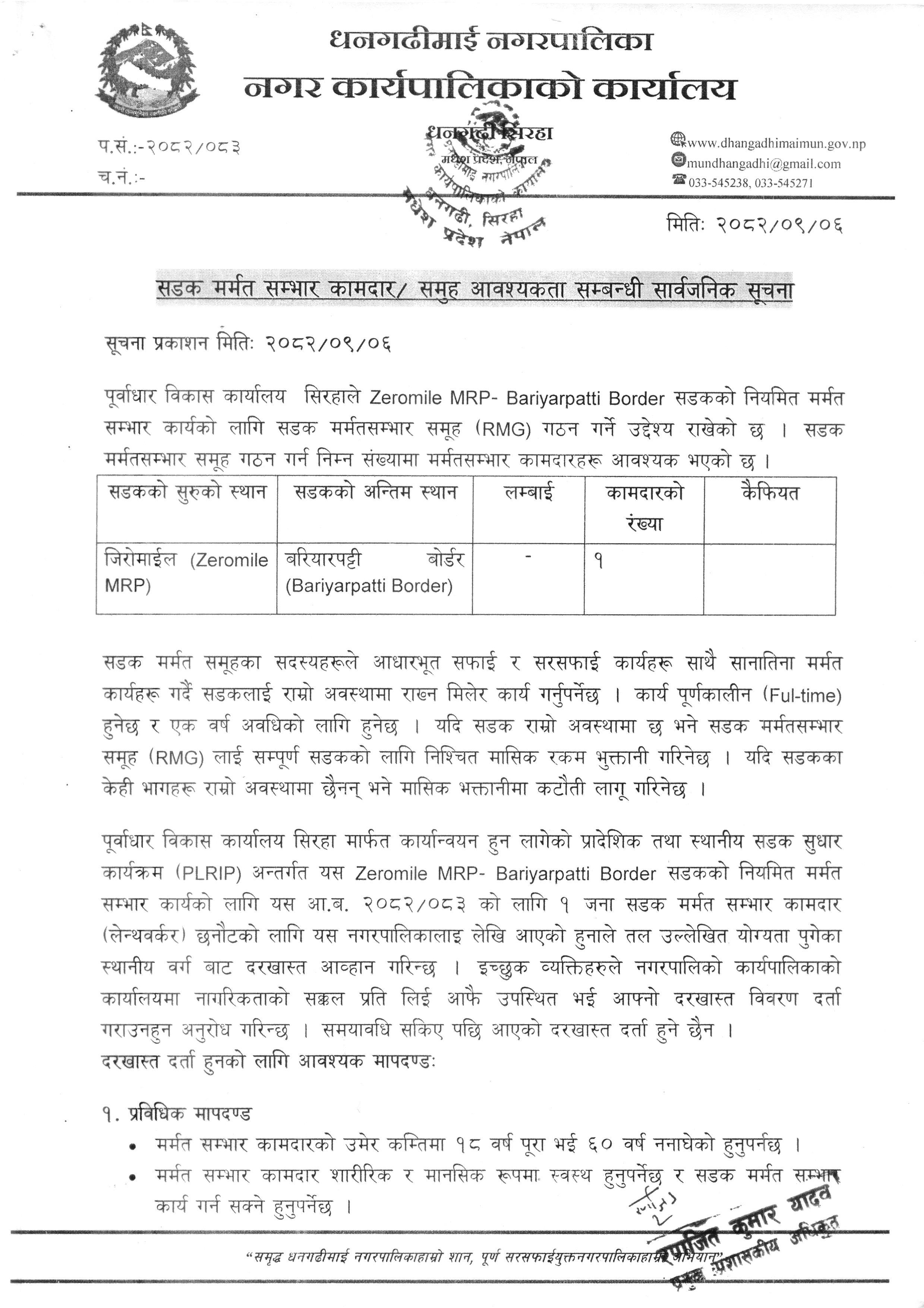 सड्क मर्मत सम्भार कामदार/समुह आवश्यकता सम्बन्धी सार्वजनिक सूचना।