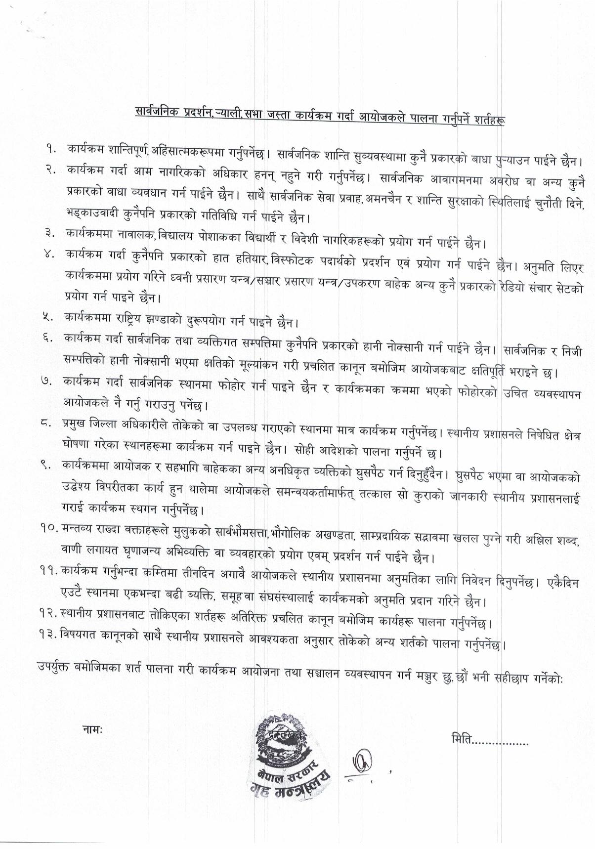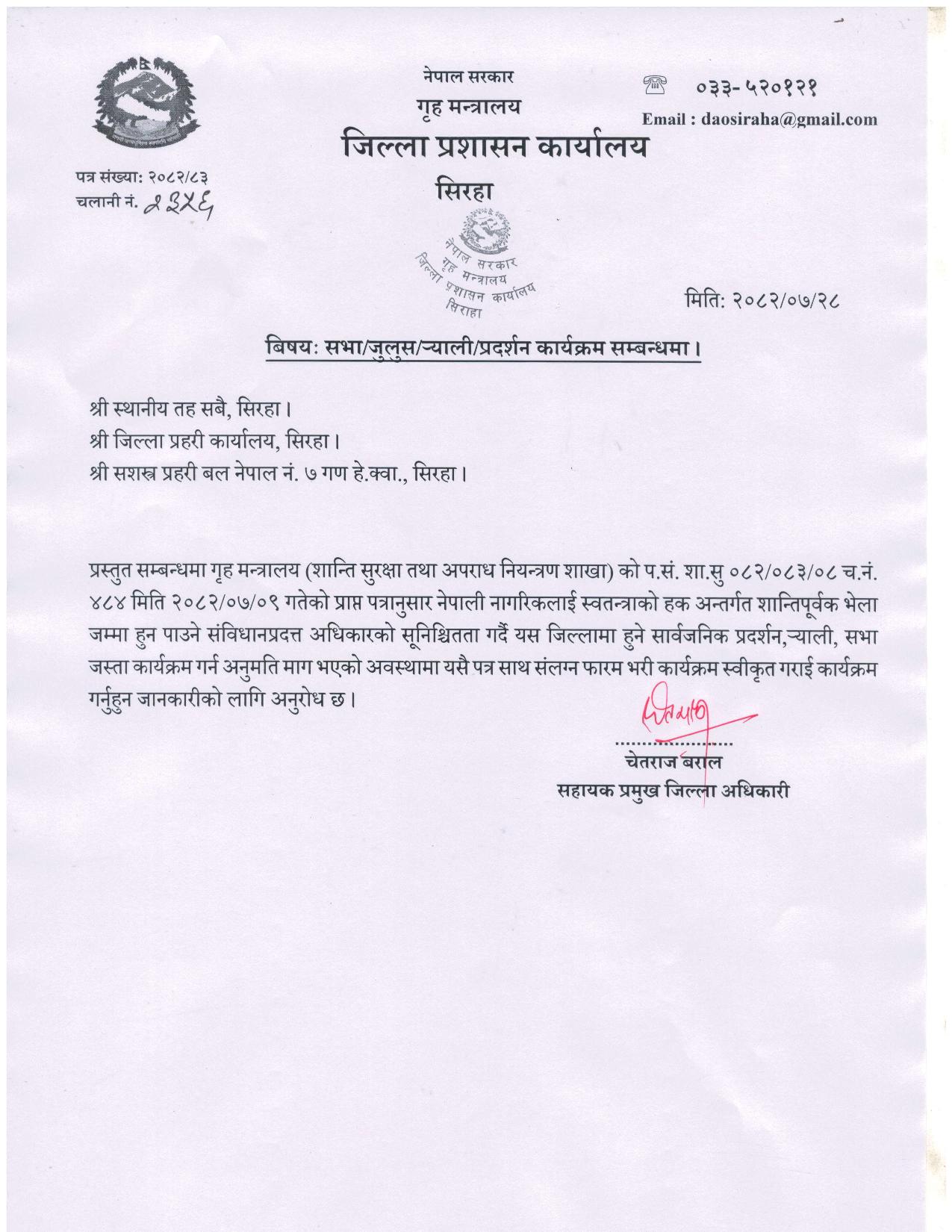 सभा/जुलुस/र्‍याली/प्रदर्शन कार्यक्रम सम्बन्धी जिल्ला प्रशासन कार्यालय, सिरहाको सूचना।